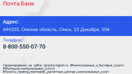 Почта Банк по адресу 644103, Омская область, Омск, 12 Декабря, 104 в дальнейшем Организация, размещена в следующих категориях: