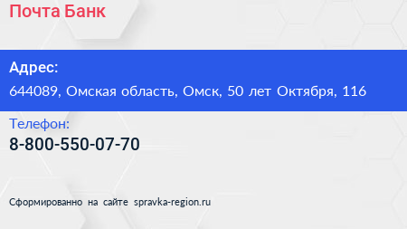 Почта Банк по адресу 644089, Омская область, Омск, 50 лет Октября, 116 в дальнейшем Организация, размещена в следующих категориях: