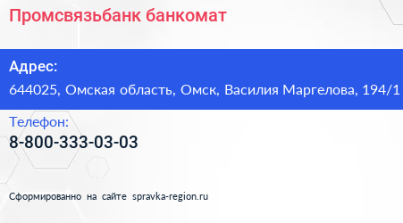 Промсвязьбанк, банкомат по адресу 644025, Омская область, Омск, Василия Маргелова, 194/1 в дальнейшем Организация, размещена в следующих категориях: