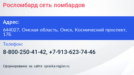 Росломбард, сеть ломбардов по адресу 644027, Омская область, Омск, Космический проспект, 17Б в дальнейшем Организация, размещена в следующих категориях: