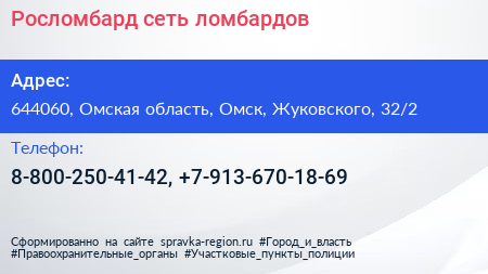 Росломбард, сеть ломбардов по адресу 644060, Омская область, Омск, Жуковского, 32/2 в дальнейшем Организация, размещена в следующих категориях: