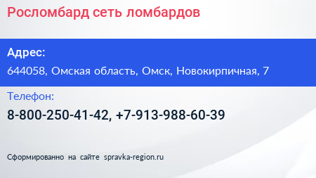 Росломбард, сеть ломбардов по адресу 644058, Омская область, Омск, Новокирпичная, 7 в дальнейшем Организация, размещена в следующих категориях: