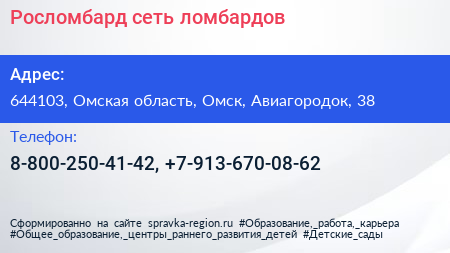 Росломбард, сеть ломбардов по адресу 644103, Омская область, Омск, Авиагородок, 38 в дальнейшем Организация, размещена в следующих категориях: