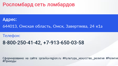Росломбард, сеть ломбардов по адресу 644013, Омская область, Омск, Завертяева, 24 к1а в дальнейшем Организация, размещена в следующих категориях: