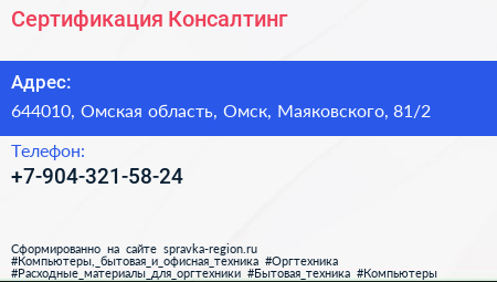 Сертификация Консалтинг по адресу 644010, Омская область, Омск, Маяковского, 81/2 в дальнейшем Организация, размещена в следующих категориях: