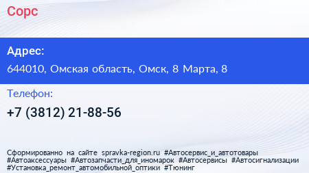 Сорс по адресу 644010, Омская область, Омск, 8 Марта, 8 в дальнейшем Организация, размещена в следующих категориях: