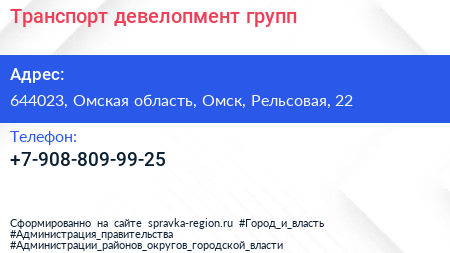 Транспорт девелопмент групп по адресу 644023, Омская область, Омск, Рельсовая, 22 в дальнейшем Организация, размещена в следующих категориях: