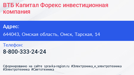 ВТБ Капитал Форекс, инвестиционная компания по адресу 644043, Омская область, Омск, Тарская, 14 в дальнейшем Организация, размещена в следующих категориях: