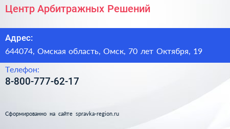 Центр Арбитражных Решений по адресу 644074, Омская область, Омск, 70 лет Октября, 19 в дальнейшем Организация, размещена в следующих категориях: