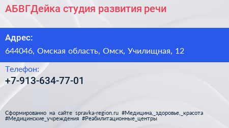 АБВГДейка, студия развития речи по адресу 644046, Омская область, Омск, Училищная, 12 в дальнейшем Организация, размещена в следующих категориях: