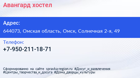 Авангард, хостел по адресу 644073, Омская область, Омск, Солнечная 2-я, 49 в дальнейшем Организация, размещена в следующих категориях: