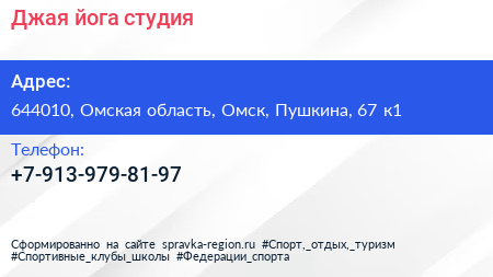 Джая, йога-студия по адресу 644010, Омская область, Омск, Пушкина, 67 к1 в дальнейшем Организация, размещена в следующих категориях: