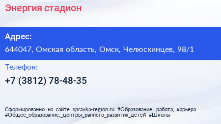 Энергия, стадион по адресу 644047, Омская область, Омск, Челюскинцев, 98/1 в дальнейшем Организация, размещена в следующих категориях: