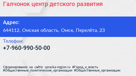 Галчонок, центр детского развития по адресу 644112, Омская область, Омск, Перелёта, 23 в дальнейшем Организация, размещена в следующих категориях:
