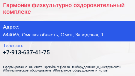 Гармония, физкультурно-оздоровительный комплекс по адресу 644065, Омская область, Омск, Заводская, 1 в дальнейшем Организация, размещена в следующих категориях: