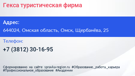 Гекса, туристическая фирма по адресу 644024, Омская область, Омск, Щербанёва, 25 в дальнейшем Организация, размещена в следующих категориях: