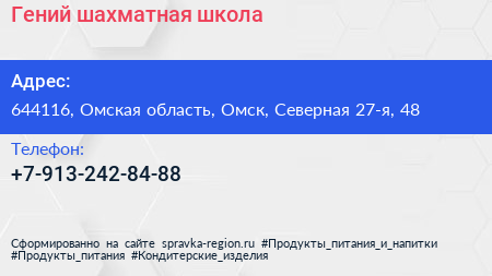 Гений, шахматная школа по адресу 644116, Омская область, Омск, Северная 27-я, 48 в дальнейшем Организация, размещена в следующих категориях:
