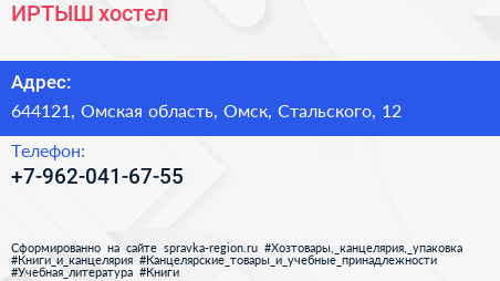 ИРТЫШ, хостел по адресу 644121, Омская область, Омск, Стальского, 12 в дальнейшем Организация, размещена в следующих категориях: