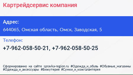 Картрейдсервис, компания по адресу 644065, Омская область, Омск, Заводская, 5 в дальнейшем Организация, размещена в следующих категориях: