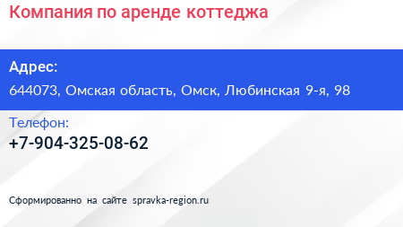 Компания по аренде коттеджа по адресу 644073, Омская область, Омск, Любинская 9-я, 98 в дальнейшем Организация, размещена в следующих категориях: