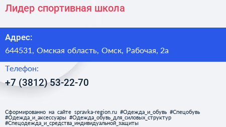 Лидер, спортивная школа по адресу 644531, Омская область, Омск, Рабочая, 2а в дальнейшем Организация, размещена в следующих категориях: