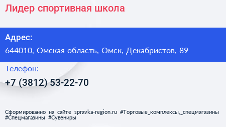 Лидер, спортивная школа по адресу 644010, Омская область, Омск, Декабристов, 89 в дальнейшем Организация, размещена в следующих категориях: