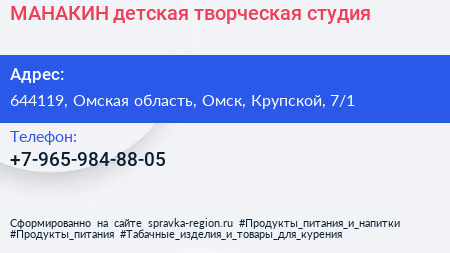 МАНАКИН, детская творческая студия по адресу 644119, Омская область, Омск, Крупской, 7/1 в дальнейшем Организация, размещена в следующих категориях: