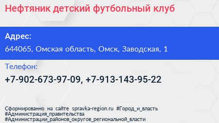 Нефтяник, детский футбольный клуб по адресу 644065, Омская область, Омск, Заводская, 1 в дальнейшем Организация, размещена в следующих категориях: