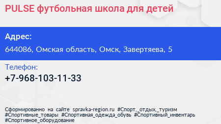 PULSE, футбольная школа для детей по адресу 644086, Омская область, Омск, Завертяева, 5 в дальнейшем Организация, размещена в следующих категориях: