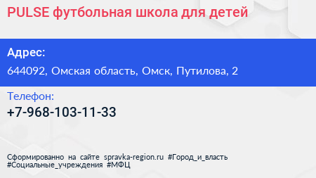 PULSE, футбольная школа для детей по адресу 644092, Омская область, Омск, Путилова, 2 в дальнейшем Организация, размещена в следующих категориях: