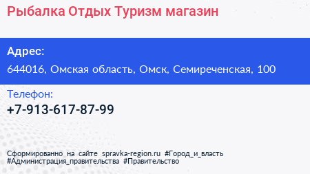 Рыбалка. Отдых. Туризм, магазин по адресу 644016, Омская область, Омск, Семиреченская, 100 в дальнейшем Организация, размещена в следующих категориях: