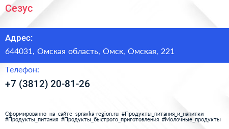 Сезус по адресу 644031, Омская область, Омск, Омская, 221 в дальнейшем Организация, размещена в следующих категориях: