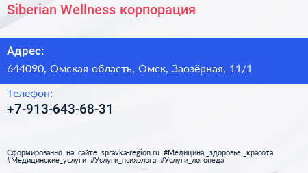 Siberian Wellness, корпорация по адресу 644090, Омская область, Омск, Заозёрная, 11/1 в дальнейшем Организация, размещена в следующих категориях: