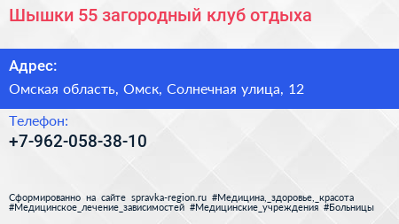Шышки 55, загородный клуб отдыха по адресу Омская область, Омск, Солнечная улица, 12 в дальнейшем Организация, размещена в следующих категориях: