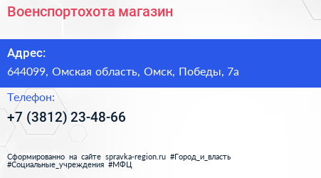 Военспортохота, магазин по адресу 644099, Омская область, Омск, Победы, 7а в дальнейшем Организация, размещена в следующих категориях: