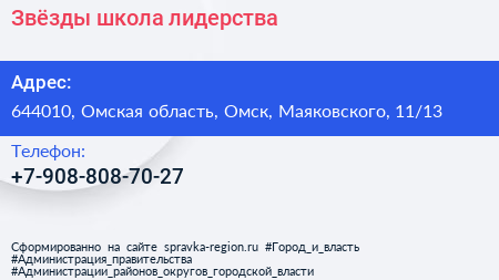 Звёзды, школа лидерства по адресу 644010, Омская область, Омск, Маяковского, 11/13 в дальнейшем Организация, размещена в следующих категориях: