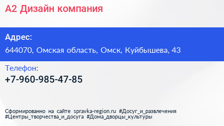 А2 Дизайн, компания по адресу 644070, Омская область, Омск, Куйбышева, 43 в дальнейшем Организация, размещена в следующих категориях: