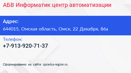 АБВ Информатик, центр автоматизации по адресу 644015, Омская область, Омск, 22 Декабря, 86а в дальнейшем Организация, размещена в следующих категориях: