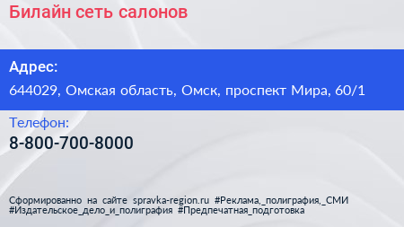 Билайн, сеть салонов по адресу 644029, Омская область, Омск, проспект Мира, 60/1 в дальнейшем Организация, размещена в следующих категориях: