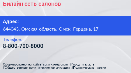 Билайн, сеть салонов по адресу 644043, Омская область, Омск, Герцена, 17 в дальнейшем Организация, размещена в следующих категориях:
