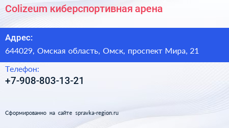 Colizeum, киберспортивная арена по адресу 644029, Омская область, Омск, проспект Мира, 21 в дальнейшем Организация, размещена в следующих категориях: