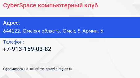 CyberSpace, компьютерный клуб по адресу 644122, Омская область, Омск, 5 Армии, 6 в дальнейшем Организация, размещена в следующих категориях: