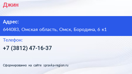 Джин по адресу 644083, Омская область, Омск, Бородина, 6 к1 в дальнейшем Организация, размещена в следующих категориях: