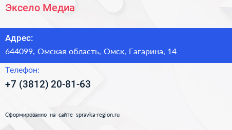 Эксело Медиа по адресу 644099, Омская область, Омск, Гагарина, 14 в дальнейшем Организация, размещена в следующих категориях: