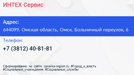 ИНТЕХ-Сервис по адресу 644099, Омская область, Омск, Больничный переулок, 6 в дальнейшем Организация, размещена в следующих категориях: