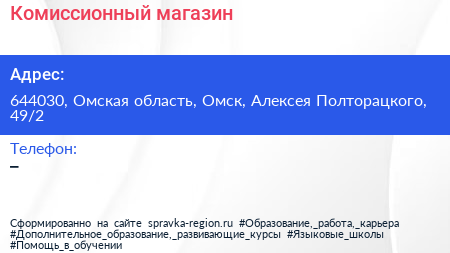 Комиссионный магазин по адресу 644030, Омская область, Омск, Алексея Полторацкого, 49/2 в дальнейшем Организация, размещена в следующих категориях: