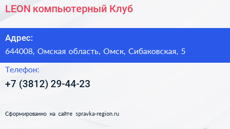 LEON, компьютерный Клуб по адресу 644008, Омская область, Омск, Сибаковская, 5 в дальнейшем Организация, размещена в следующих категориях: