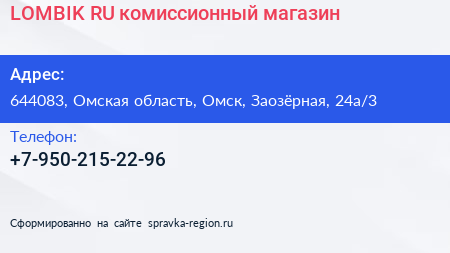 LOMBIK.RU, комиссионный магазин по адресу 644083, Омская область, Омск, Заозёрная, 24а/3 в дальнейшем Организация, размещена в следующих категориях: