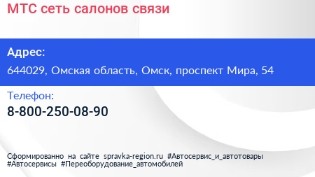 МТС, сеть салонов связи по адресу 644029, Омская область, Омск, проспект Мира, 54 в дальнейшем Организация, размещена в следующих категориях: