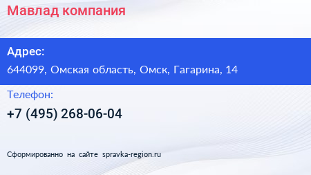 Мавлад, компания по адресу 644099, Омская область, Омск, Гагарина, 14 в дальнейшем Организация, размещена в следующих категориях: